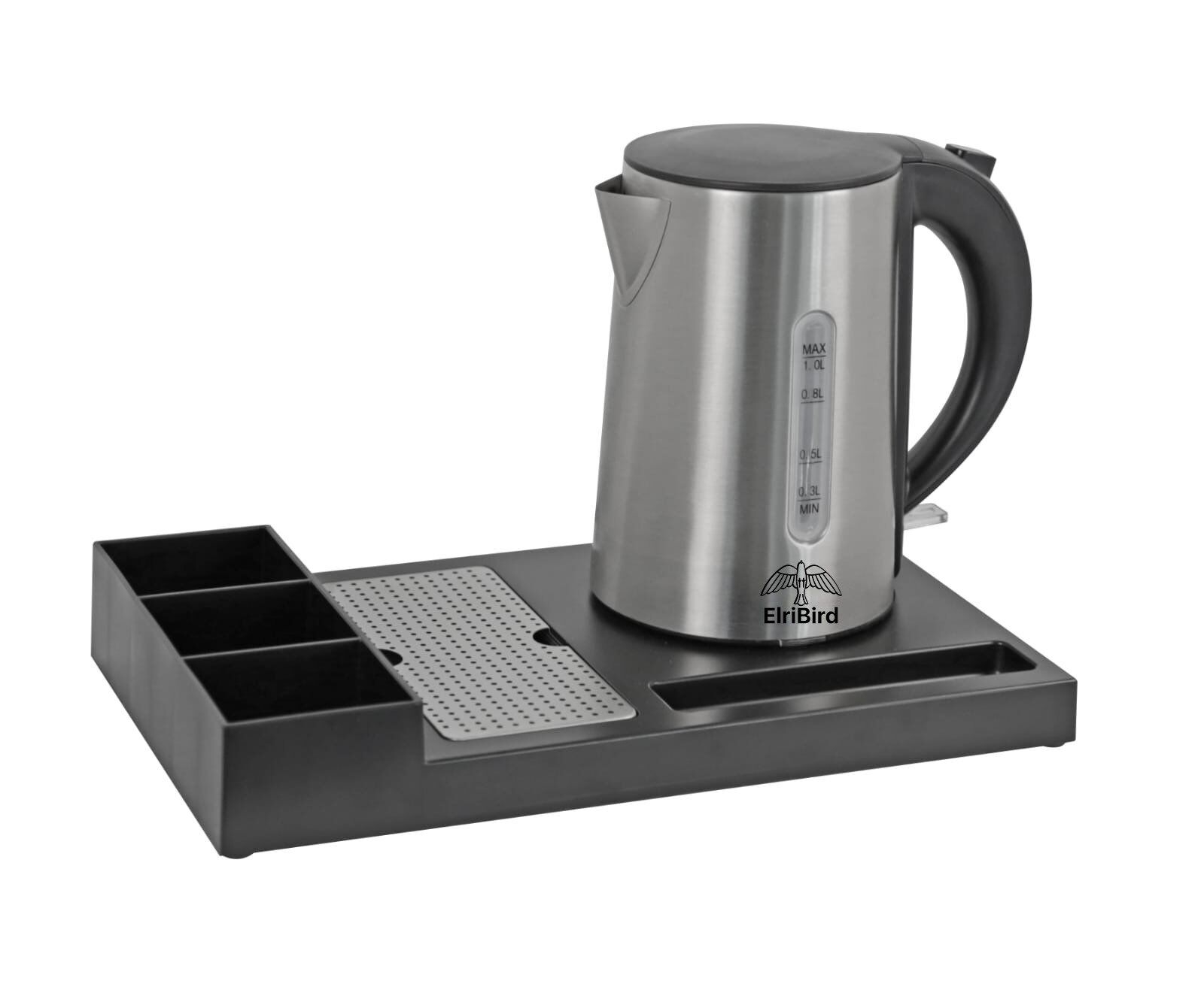 - Elevate your hotel’s-in-room beverage service with the ElriBrid stainless steel kettle with ABS tray set. Crafted to perfection, this set combines a sleek stainless steel kettle with a functional serving tray, making it a must-have addition to your hotel supplies and amenities collection. Here’s why our product stands out: